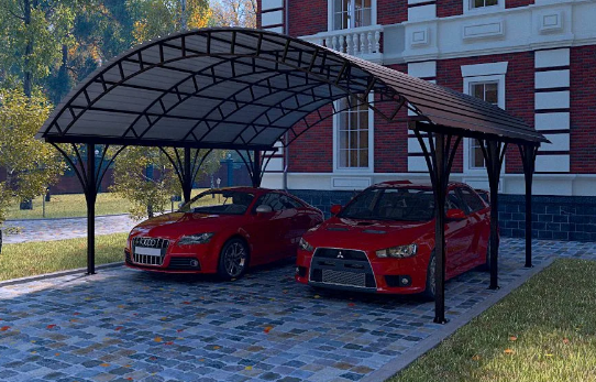 - Арочный навес из профнастила и беседка — самое распространенное применение гнутого профиля.