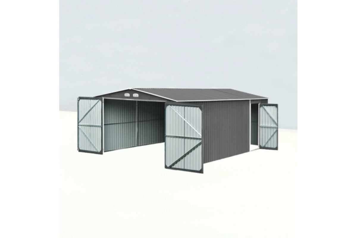 передняя двойная дверь с замком, боковая дверь с замком, четыре вент.отверстия, рамное основание крыши, полный набор крепежа Гараж с колоссальной площадью 23 м². Его можно превратить в огромную мастерскую, студию, гараж для машины или лодки. Изготовлен из высококачественной оцинкованной стали.