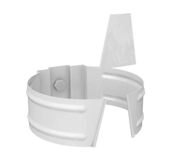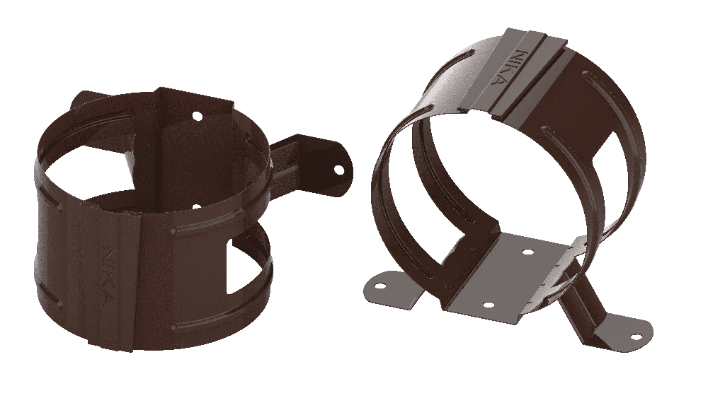 Держатель трубы D100 (на дерево)  сделана из оцинкованной стали 0.6 мм толщиной. В качестве защитного барьера от солнечного света, механических повреждений, осадков применено покрытие Пластизол двусторонний. Такая система подходит как для частного дома, так и для индустриальных объектов. Она долговечна, экономична и эффективно отводит воду с кровли.