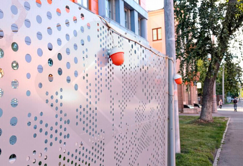 Ограждения из перфорированного профлиста могут выполнять не только защитную, но и эстетическую функцию. Благодаря возможности индивидуального дизайна перфорации, на поверхности можно создавать узоры, логотипы, названия компании или тематические изображения. Также такие ограждения легко использовать для размещения баннеров, информационных щитов и рекламных панелей.