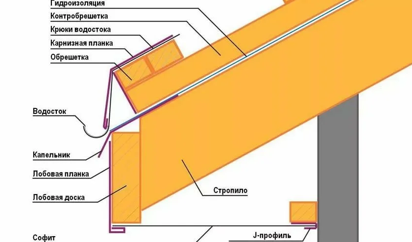 Капельник, в отличие от карнизной планки, выводится под водосточный желоб, а не в него. Поэтому в нижней части он не прилегает к брусу, а свешивается с него, чтобы как можно меньшее количество влаги попадало на лобовую планку.