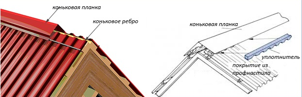 Начнем с того, что профнастил – материал профилированный. То есть его форма – это волны скругленной или трапециевидной формы. Установленный на них конек обеспечивает стопроцентную вентиляцию. Он примыкает монтажными полками к верхним волнам кровельного материала, к ним и крепится, а через пространство, образованного плоскостями нижних волн и полкой конька, выходит воздух из-под кровельного покрытия.