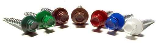 Для металлочерепицы, поликарбоната и прочих листовых материалов с полимерным покрытием обычно используют окрашенные по системе RAL кровельные саморезы. Цвет шляпки соответствует цвету кровельного материала.