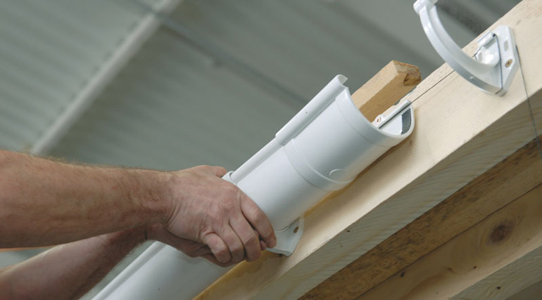 Пластиковая водосточная система зимой испытывает очень большую нагрузку, поэтому кронштейны и хомуты надежно закрепляют. Кронштейны лучше крепить к стропилам или кобылкам – это более прочная конструкция, чем обрешетка кровли или карнизная доска. Соединять между собой пластиковые водосточные элементы можно при помощи клея или прокладок. При помощи прокладок предпочтительней – соединение всегда можно разобрать и заменить любой фрагмент системы. При склейке пластиковых элементов получается неразборное соединение, и любой ремонт вызовет дополнительные сложности.