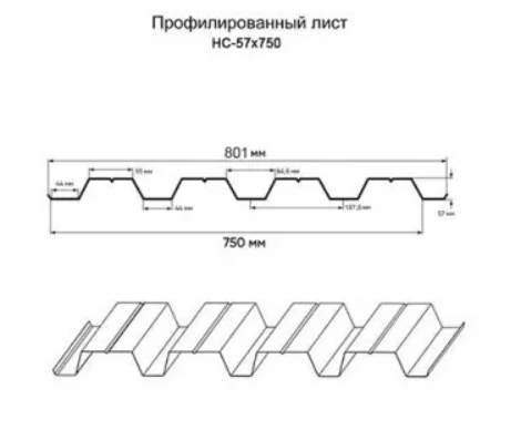 НС57 имеет три ребра жесткости, которые расположены с шагом 92 мм. Ребра обеспечивают дополнительную прочность и жесткость листам.