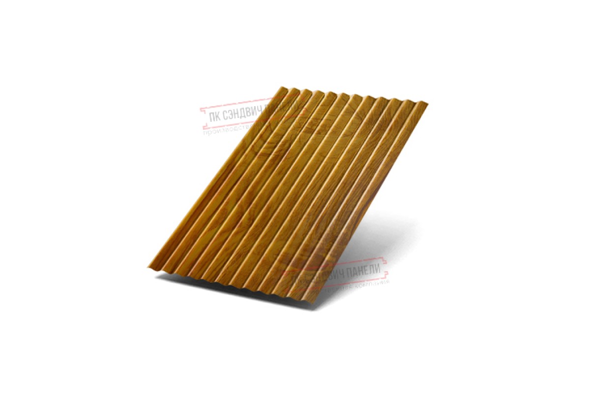 Профилированный лист МП18х1100 ECOSTEEL_T-ЗолотойДуб-0.5 широко применяется в Мурино для обустройства фасада. Изначально он представляет собой металлический оцинкованный лист толщиной 0.5 мм с покрытием. После проката на специальном оборудовании сталь приобретает рисунок из повторяющихся волн. Такая форма придает профилю несущую способность.