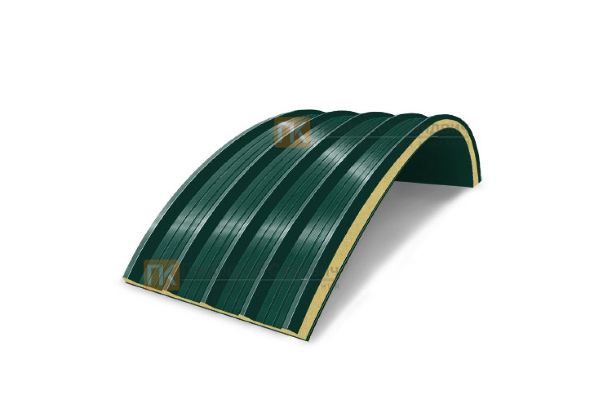 Купить сэндвич-панели арочные с пенополиуретаном, ширина 1000 мм, толщина 100 мм, 0.5/0.5, RAL6005 недорого для надежной эксплуатации в любых условиях.