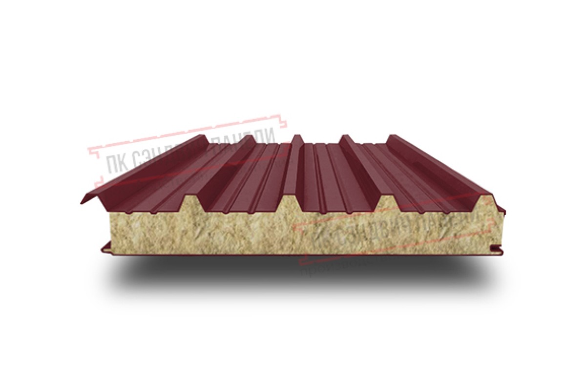 Сэндвич-панель кровельная с утеплителем из минеральной ваты толщиной 180 мм — это надежное решение для сооружения долговечной крыши. Изделие состоит из двух оцинкованных листов металла по 0,5 мм, окрашенных в глубокий бордовый цвет по шкале RAL3005. Конструкция обеспечивает превосходную изоляцию благодаря наполнителю с высокими термозащитными и акустическими свойствами. Надежная замковая система упрощает укладку, исключая щели и зазоры. Ширина элемента составляет 1000 мм, что позволяет быстро перекрывать большие площади. Такой материал устойчив к внешним нагрузкам и неблагоприятным условиям.