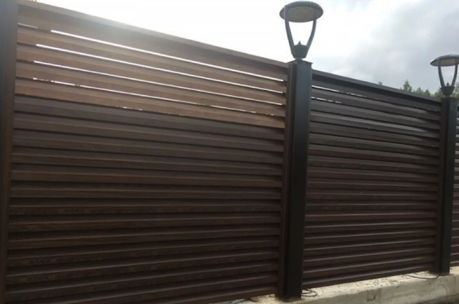 Жалюзийное ограждение состоит из металлических горизонтальных узких панелей-ламелей, расположенных на расстоянии друг от друга, зафиксированных на опорных столбах. Такой горизонтальный забор из металлического профиля пропускает воздух и солнечный свет на участок и, вместе с тем, создает шумовой барьер и обеспечивает защиту территории от проникновения посторонних.