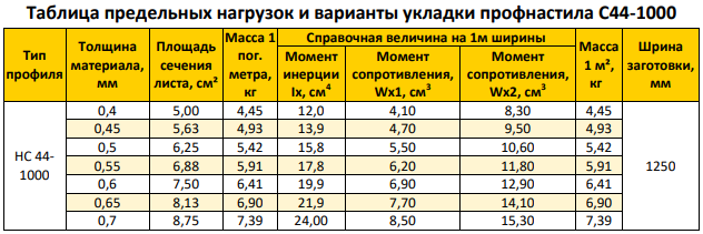 Основные размеры профлиста С44: