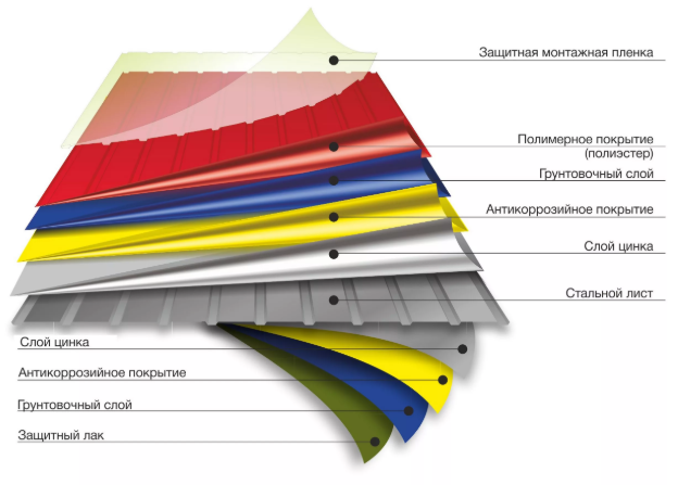 Стальной лист предварительно защищен от коррозии слоем цинка, затем металл дополнительно защищается нанесением слоя полимерной композиции, которая с наружной стороны колеруется для улучшения декоративных свойств. После этого формируются гребни. Покрытие не задерживает снег, лед и дождевую воду, мелкий мусор легко соскальзывает с него, не царапая поверхность. Антикоррозионные характеристики листа повышаются, и нормальный срок эксплуатации конструкций может достигать 50 лет и более.