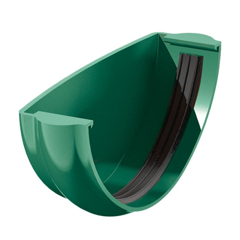 Заглушка желоба D150 сделана из стали промышленной оцинковки 0.6 мм толщиной. В качестве защитного барьера от осадков, солнечного света, механических воздействий использовано покрытие Пластизол двусторонний. Такая система подходит как для частного дома, так и для индустриальных объектов. Она долговечна, экономична и легко монтируется.